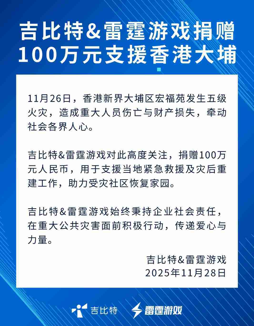 • 公司新闻 一竞技&雷霆游戏捐赠100万元 支援香港大埔火灾救援及灾后重建