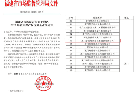 近日,,,福建省市场监督管理局公示了2023年福建省知识产权优势企业名单,,,,厦门一竞技网络技术股份有限公司(以下简称“一竞技”或“公司”)榜上有名。。